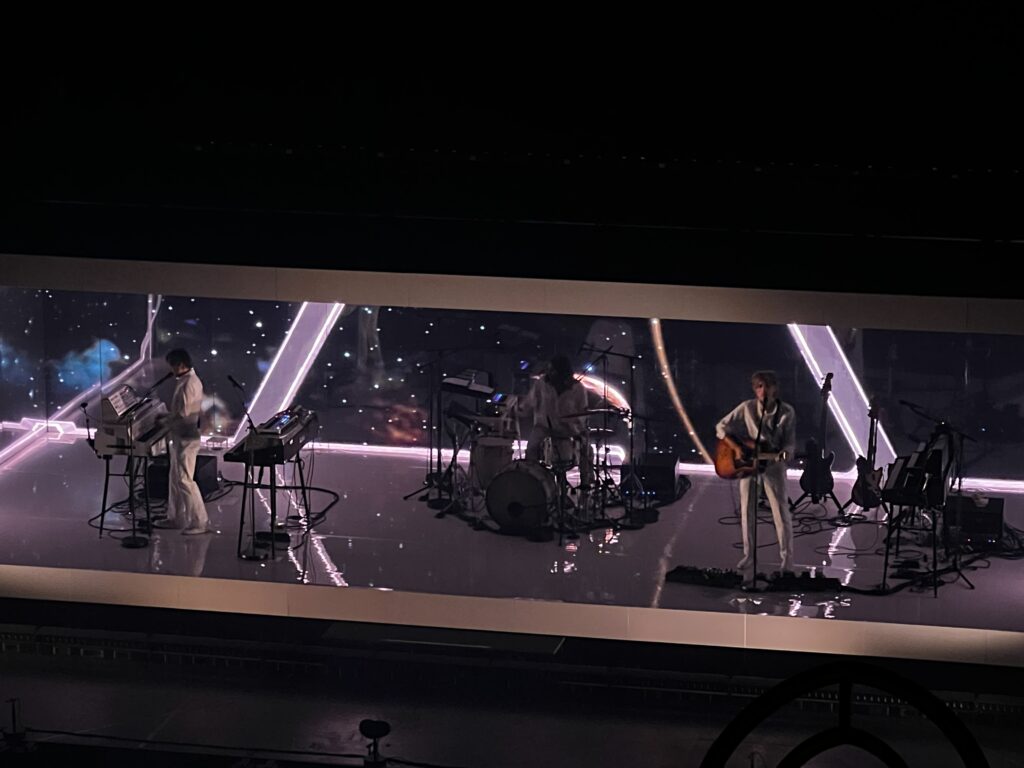 Die Setlist war erwartbar, die US-Sängerin Beth Hirsch, die zwei der schönsten Songs des Albums gesungen hatte, war erwartungsgemäß leider nicht mit dabei. Ihre Stimme wurde mit Effekten belegt vom Band eingespielt, eine kreative Idee, um keine andere Sängerin für den Part verpflichten zu müssen. Der Star des Abends war allerdings die Bühne, die – zum Leidwesen der Zuschauer auf den obersten Rängen – in einem verspiegelten Kasten war, was ganz erstaunliche Lichteffekte und Visuals ermöglichte, die man so noch nie gesehen hatte.