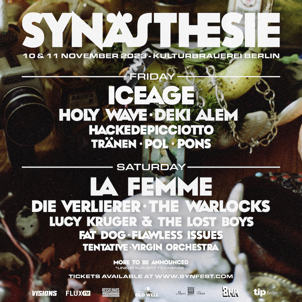 Vom 10. bis 11. November 2023 findet in der Berliner Kulturbrauerei wieder das Synästhesie Festival statt: In diesem Jahr sind neben dem neuen Duo von Gwen Dolyn und Steffen Israel von Kraftkub, die die Neue Deutsche Welle mit dem Projekt Tränen am Leben erhalten dabei, dazu u. a. das dänische Post-Punk-Quartett Iceage, Hackedepicciotto mit Alexander Hacke (Einstürzende Neubauten) & Danielle de Picciotto oder Holy Wave dabei.
